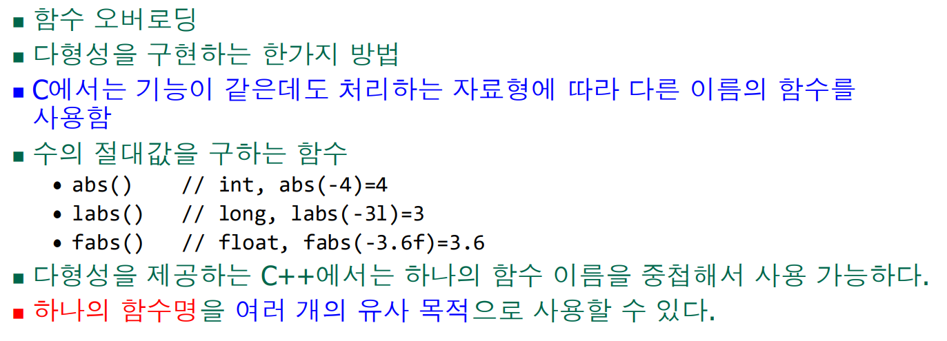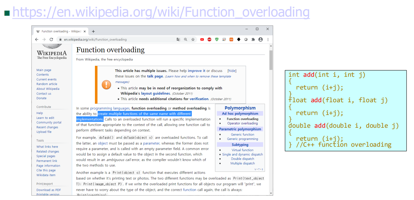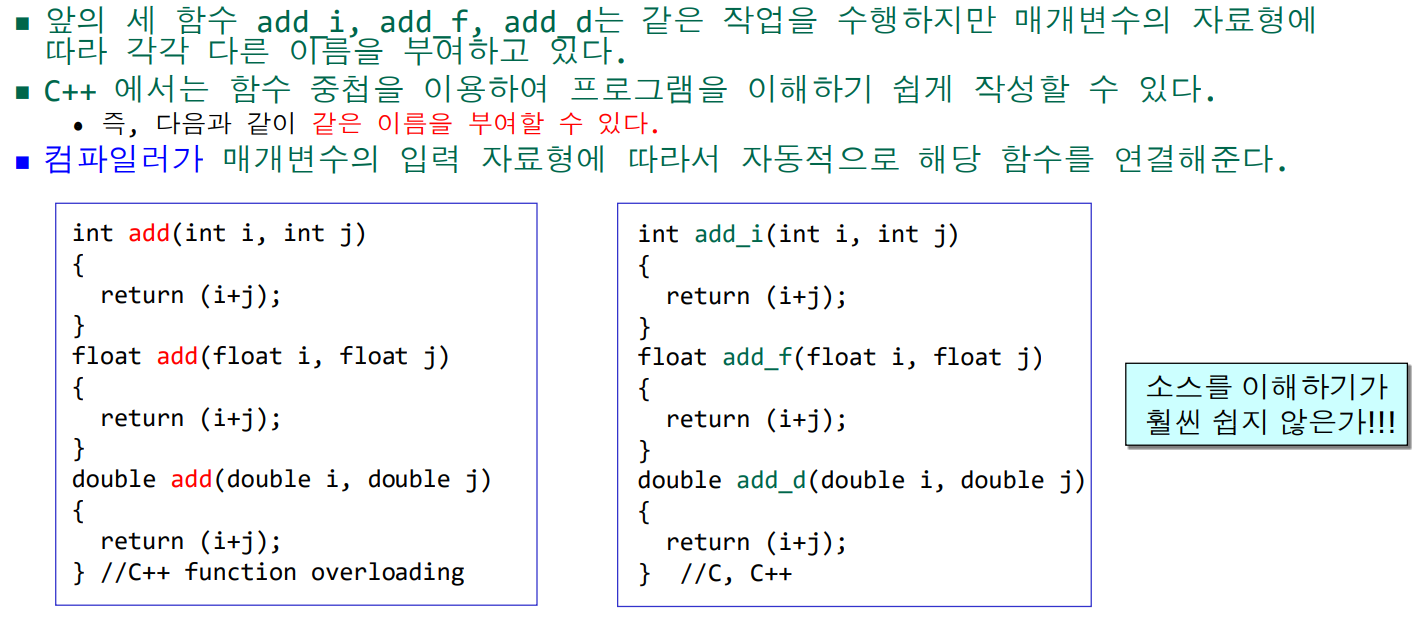 add(10,20)에 의해서는첫 번째 add()함수가 불려지고, add(10.5,20.3)에 의해서는 두 번째 add()함수가 불려진다. 즉, 컴파일러가 실매개변수의입력 자료형에 따라서 자동적으로 해당 함수를 연결해준다.