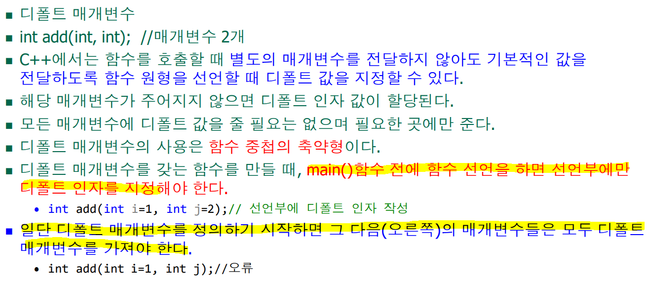 int add(int i = 1, int j = 2); //선언부에 작성