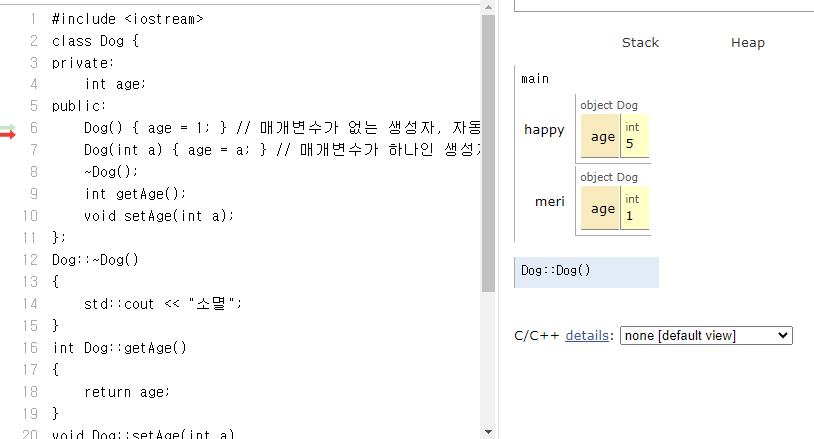 디폴트 매개변수를 갖는 생성자이므로 생성자 중첩을 시키는 효과와 같다. 디폴트 매개변수의 사용은 함수 중첩의 축약형인 것을 알 수 있다. 즉, 다음과 같은 2개의 생성자가 있는 것과 같다. Dog() {age=1;} Dog(int a){age=a;}