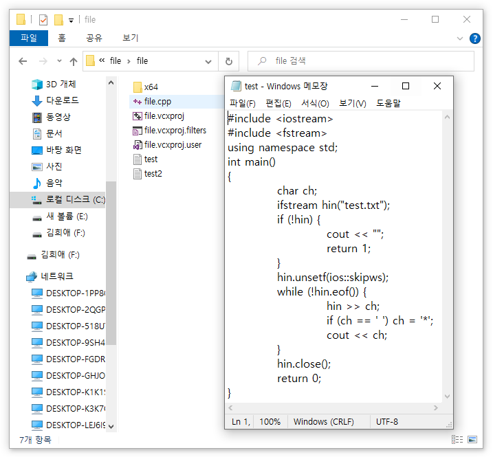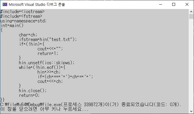 11. "test.txt"에 저장된 내용을 읽어들여 공백을 "*"로 채워 화면에 출력