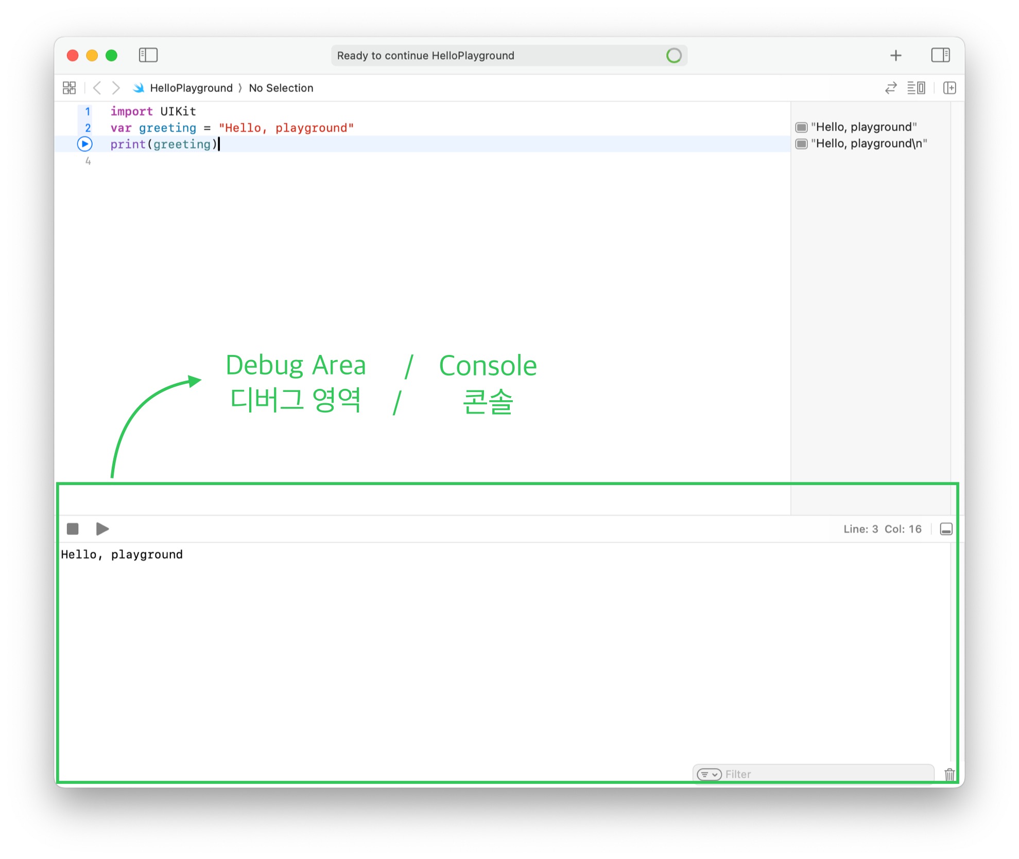 - 화면 아래쪽에서 표시되는 부분, 실행 결과를 표시 → Debug Area(디버그 영역)