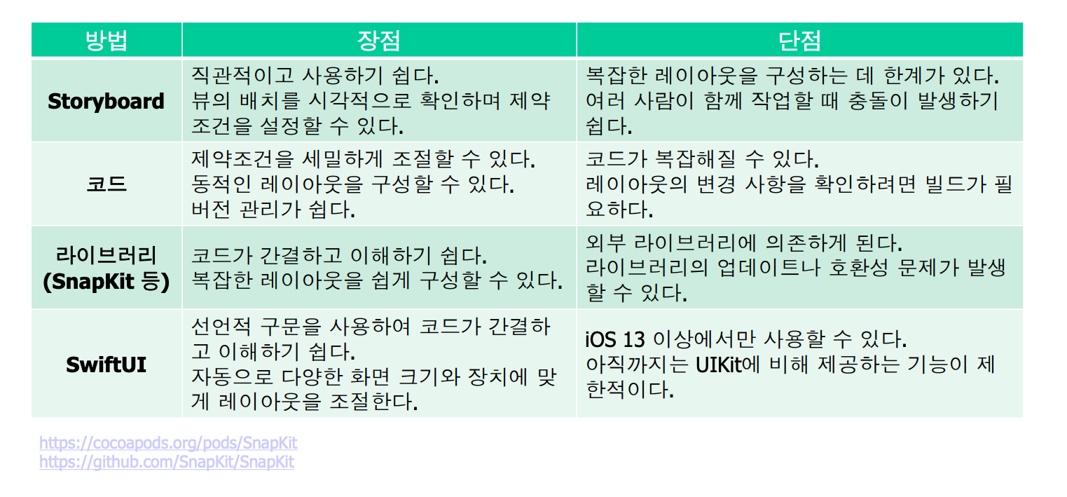 3. 코드에서 NSLayoutConstraint 사용 - 프로그래밍적으로 유연하게 제약 조건 설정 가능<br>- 동적 UI 생성에 적합 - 코드가 길어질 수 있고 가독성이 떨어질 수 있음<br>- 실시간 미리보기가 어려움