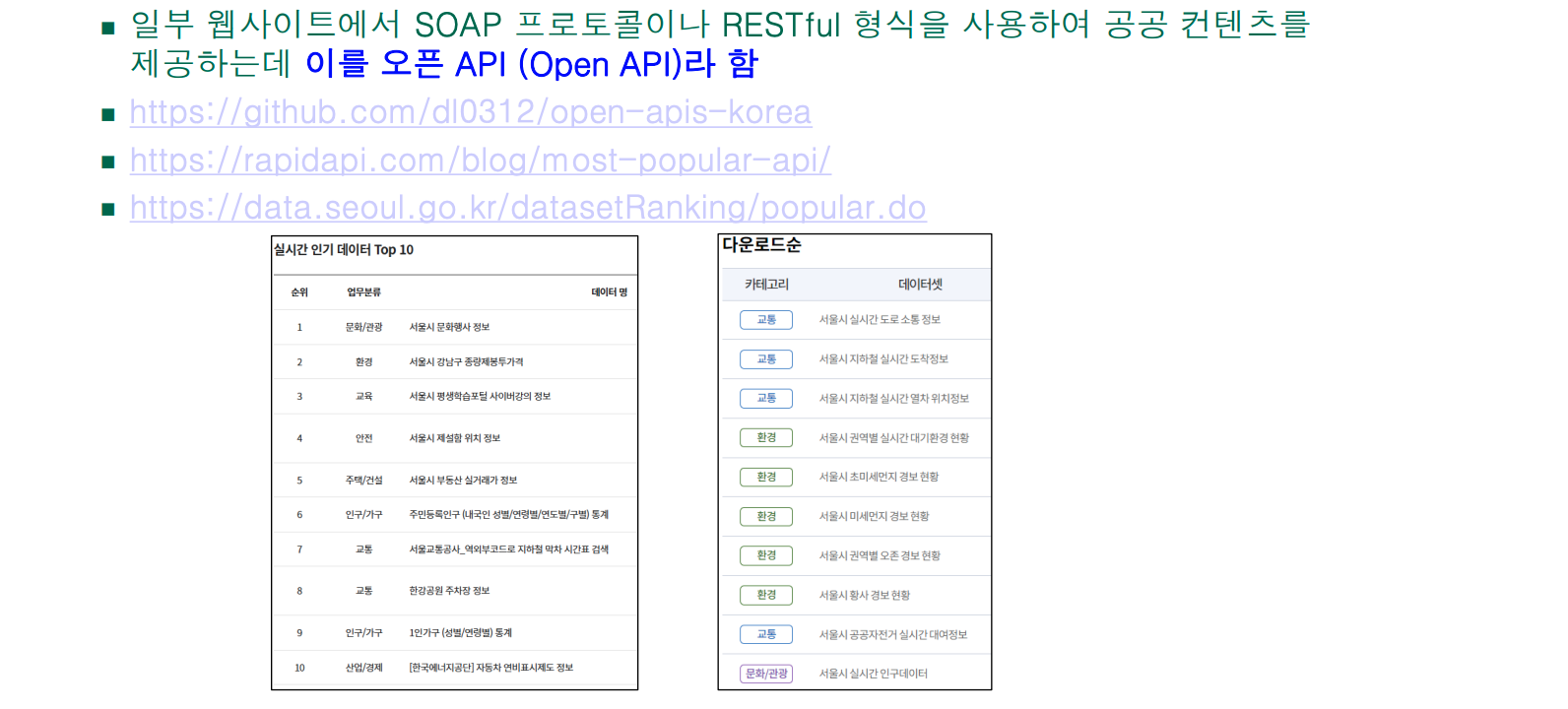 - 원하는 정보를 제공하는 웹 서비스와 사용할 Open API 선정