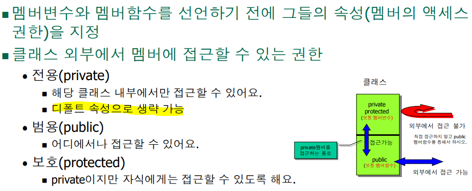 접근 속성이 3가지가 있다. 감출 땐 프라이티브 누구에나 줄 땐 퍼블릭 자식에만 열어주려면 protected