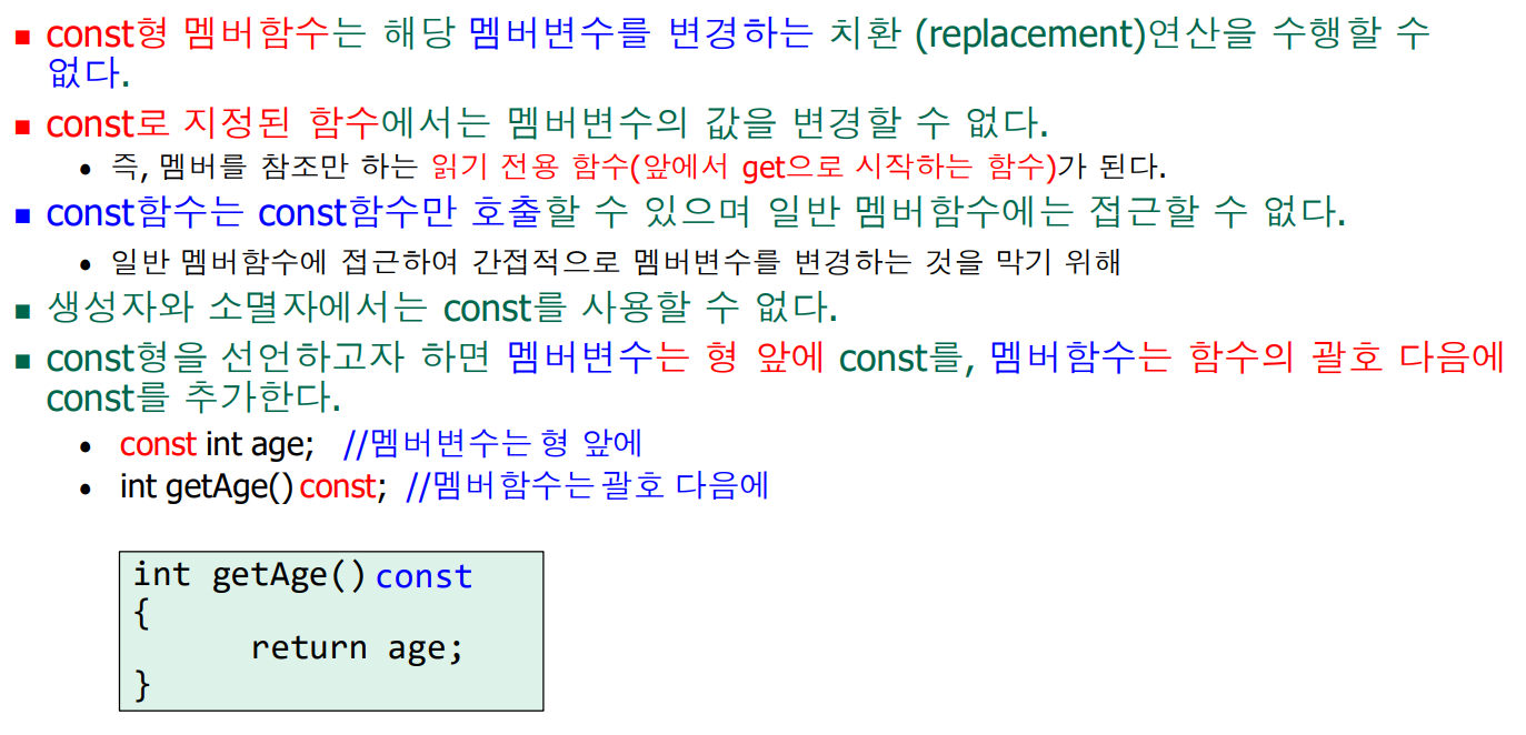 // const 멤버함수에서는 멤버변수 age를 변경(++age)할 수 없다.